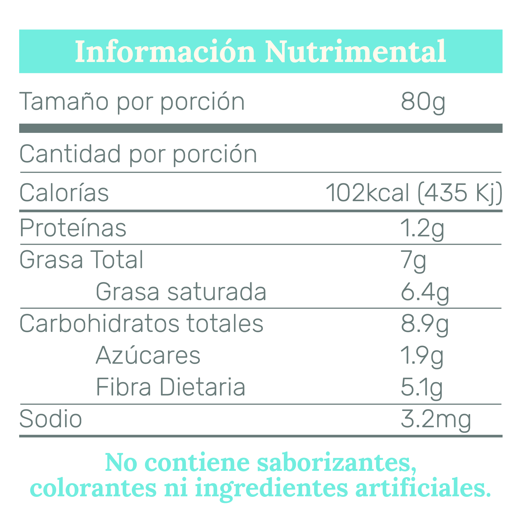 También contiene 1.2 gramos de proteína y 7 gramos de grasa, que en su mayoría (6.4 gramos) es grasa saturada. También contiene 8.9 gramos de carbohidratos totales, de los cuales 5.1 gramos son fibra dietaria y 1.9 son azúcares naturales del coco.